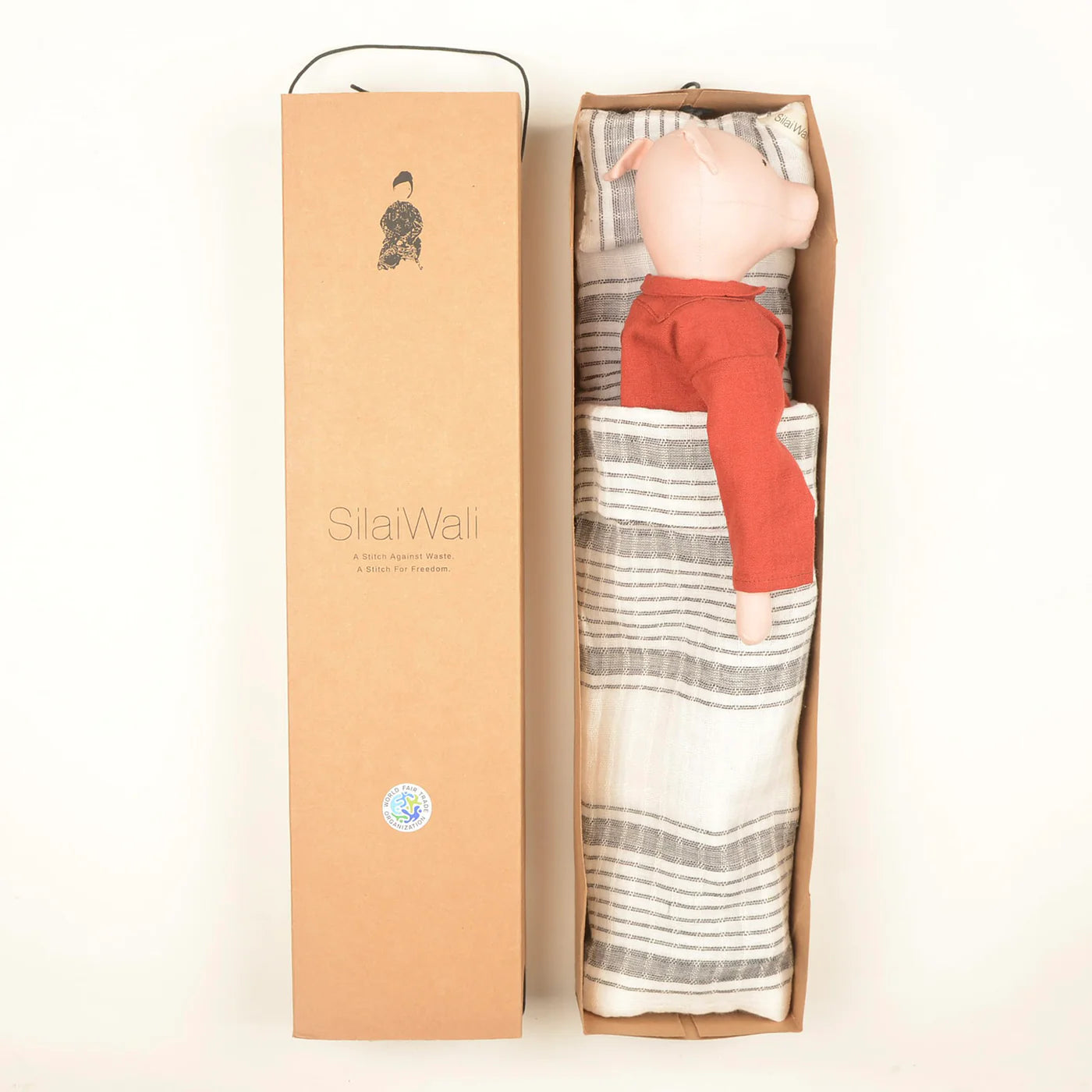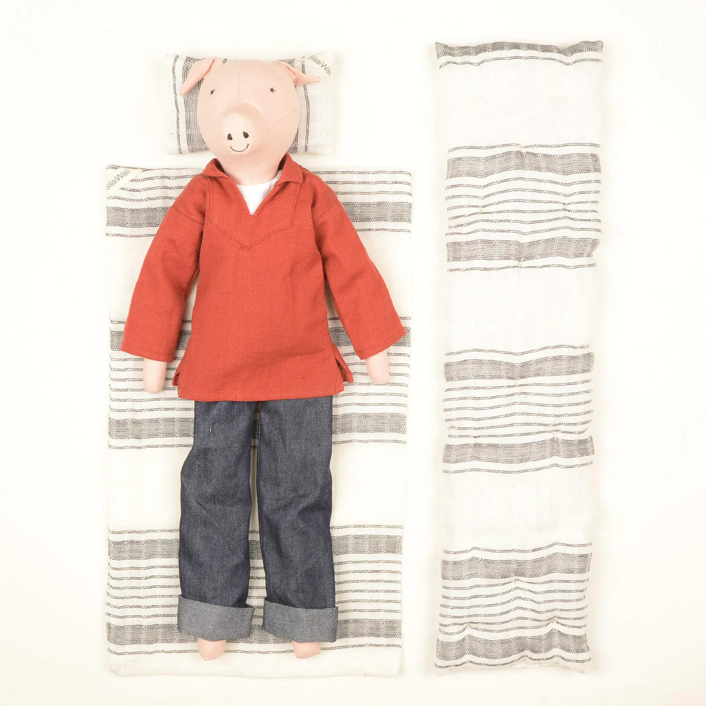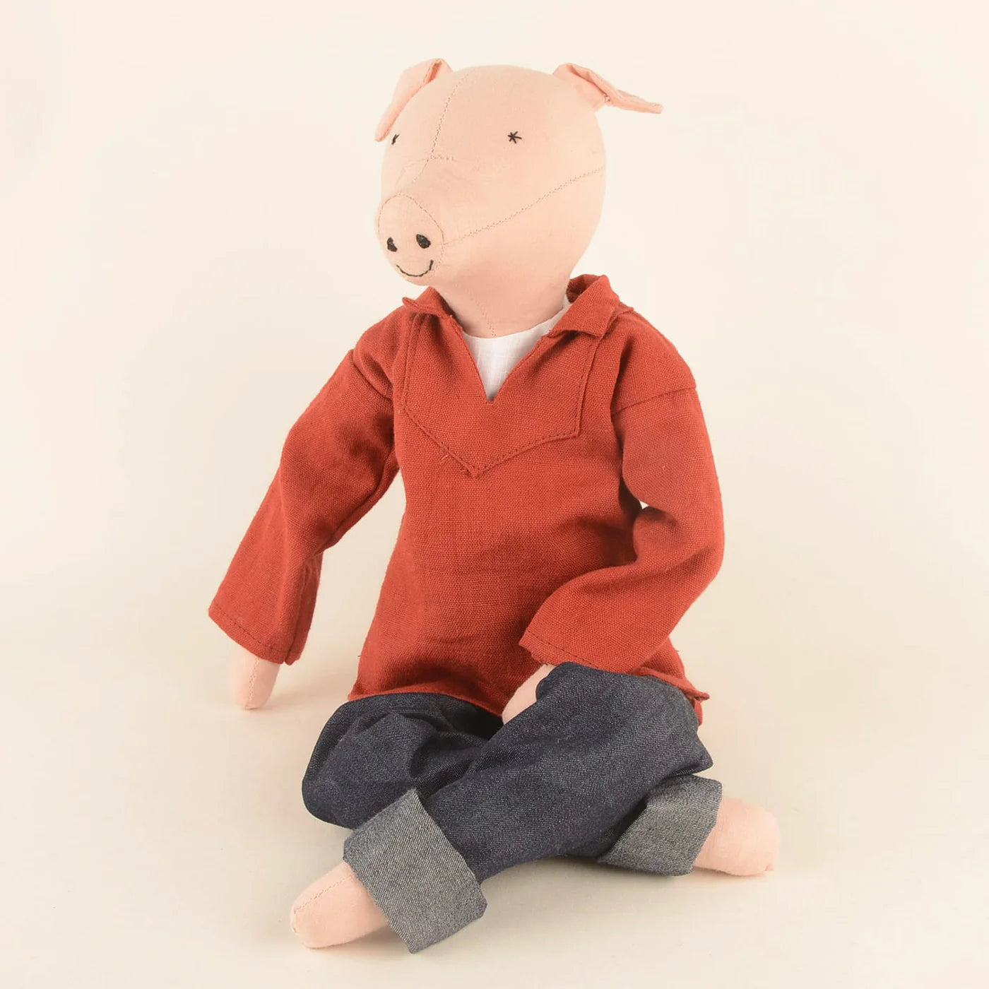 Meet Evan the Pig. Dressed in a rust-colored vareuse — the traditional fisherman’s shirt from Brittany, France — crafted from sturdy cotton canvas and paired with soft denim trousers, Evan embodies effortless elegance and rustic charm with a hint of coastal spirit.