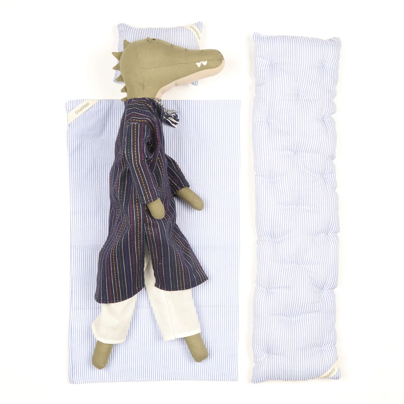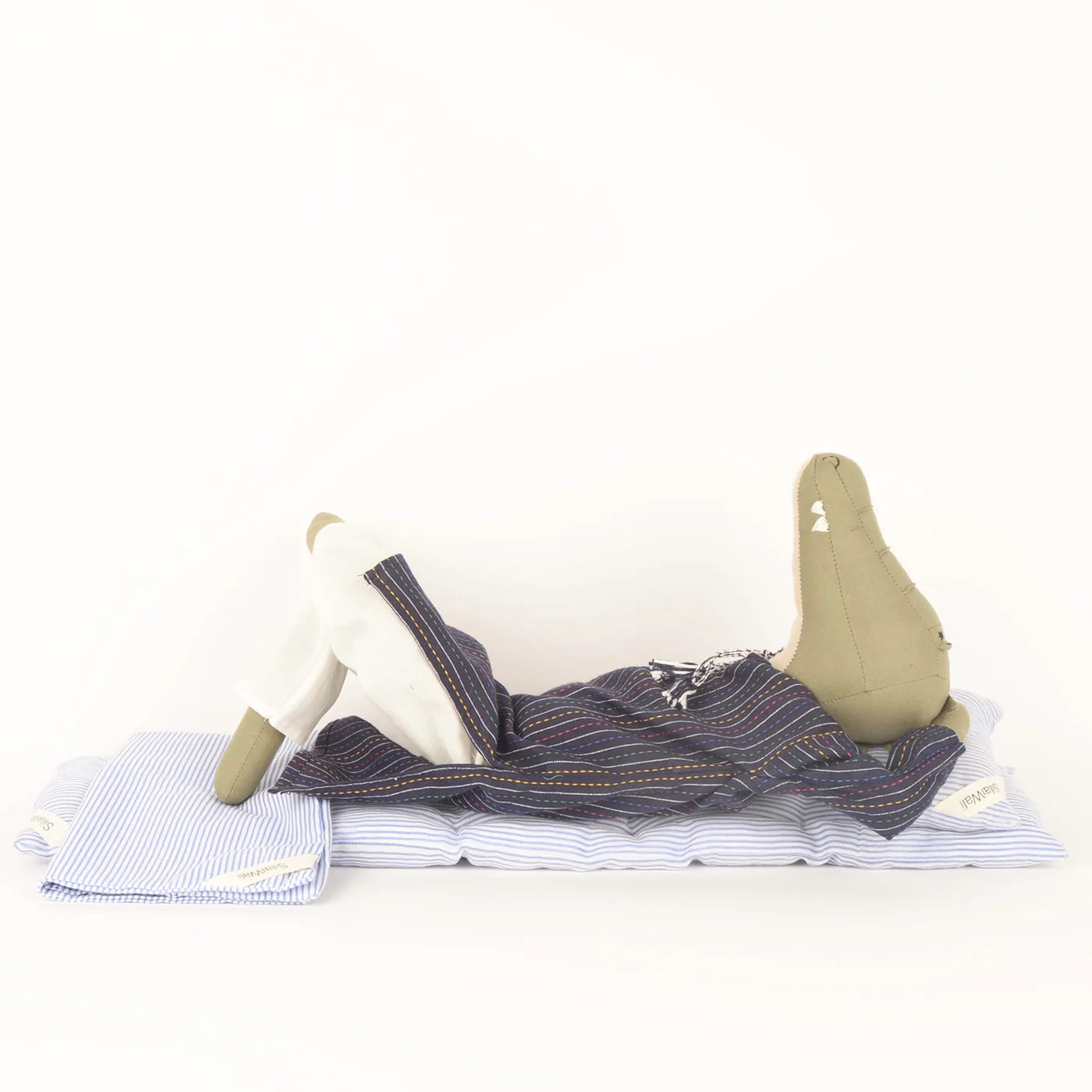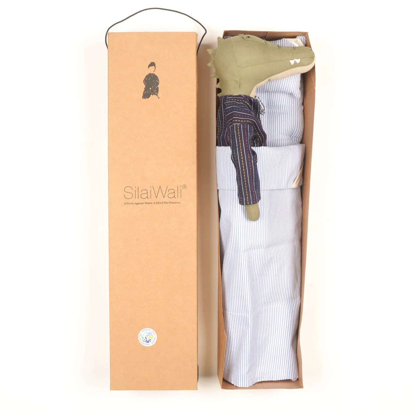 Meet Kofi the Crocodile, a thoughtful character with a gentle grin, dressed in a navy striped kurta and crisp white cotton pyjamas. His refined yet playful look draws inspiration from India’s classic everyday style, blending tradition with charm.